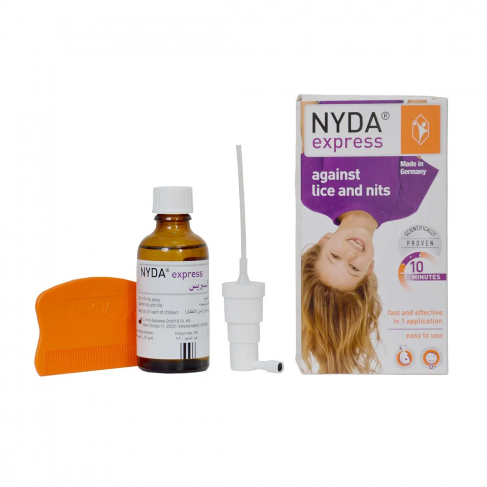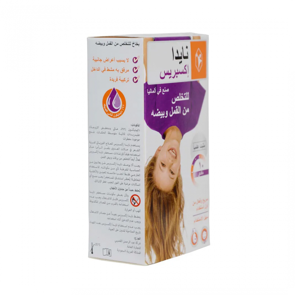 Nyda Express للتخلص من القمل وبيضها عبارة عن محلول يحتوي على مادة الميثيكون وهي مادة سيليكون تستخدم للتخلص من قمل الرأس وبيضه بعد استخدام واحد وخالي من المبيدات.